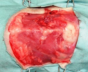 手術写真③ 縮小させた胃を、捻転の再発を起こさせないために胃を腹壁に固定します。 |