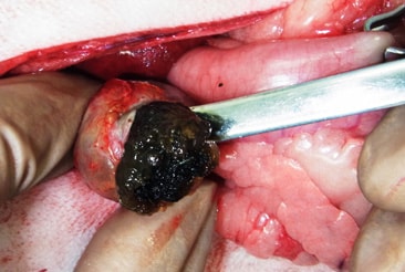 胆嚢切開すると中から粘土状の胆泥がでてきます。 |