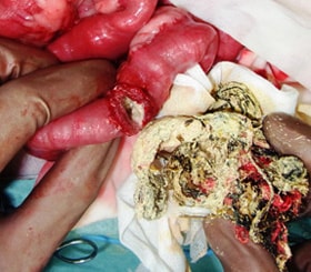 【手術前】 腸閉塞を起こした小腸、黒く変色している場所が壊死した小腸 |