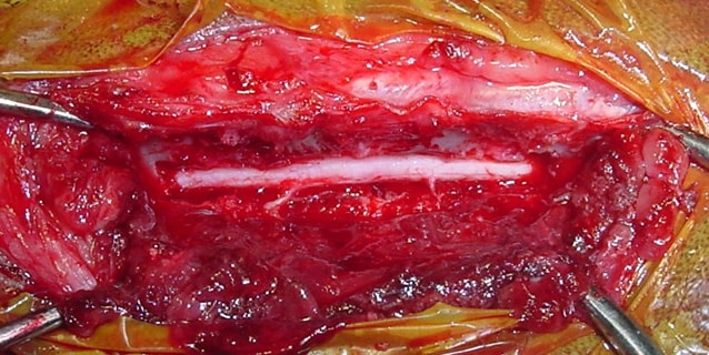 ヘルニア物質をきれいに取り除き、脊髄の圧迫がとれて、きれいにまっすぐになった脊髄です。 |